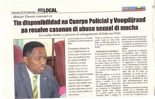 De minister van Justitie is overtuigd dat het politiekorps van Aruba en ook de KZP serieus de gevallen van seksueel misbruik willen onderzoeken. “Er is zeker, zeker bereidheid bij elke politieagent die in het departement werkt om elke aangifte aan te nemen en de mensen aan te horen.”